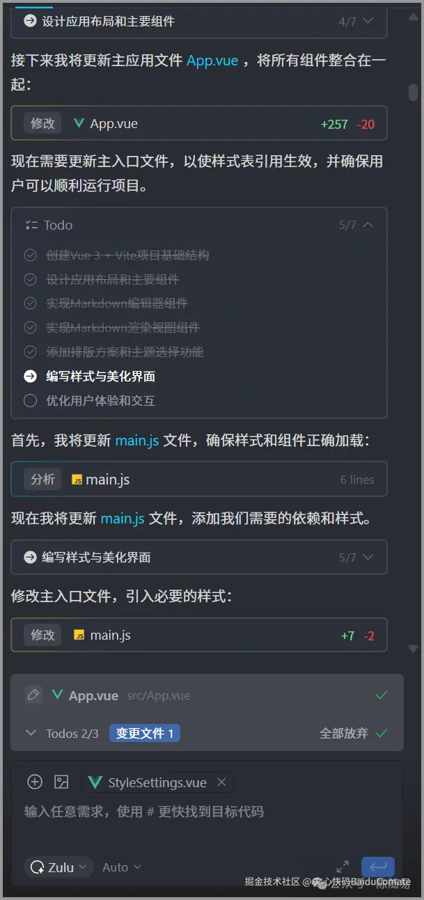 咱们来看看实际效果,给我的第一印象就是:简洁高效。界面设计识别度高,文字和编辑有非常明显的区分和层次,让人一眼就能看到 这个工具到底在做什么,适合想对AI编码过程有一个大概把控的开发者。