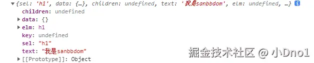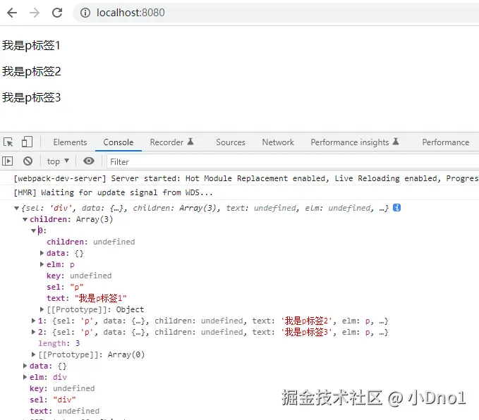 chilren变成了一个数组,里面是三个p标签的数据,text是undefined,因为div里面是三个子元素,不是文字,这就是一个简单的虚拟节点。