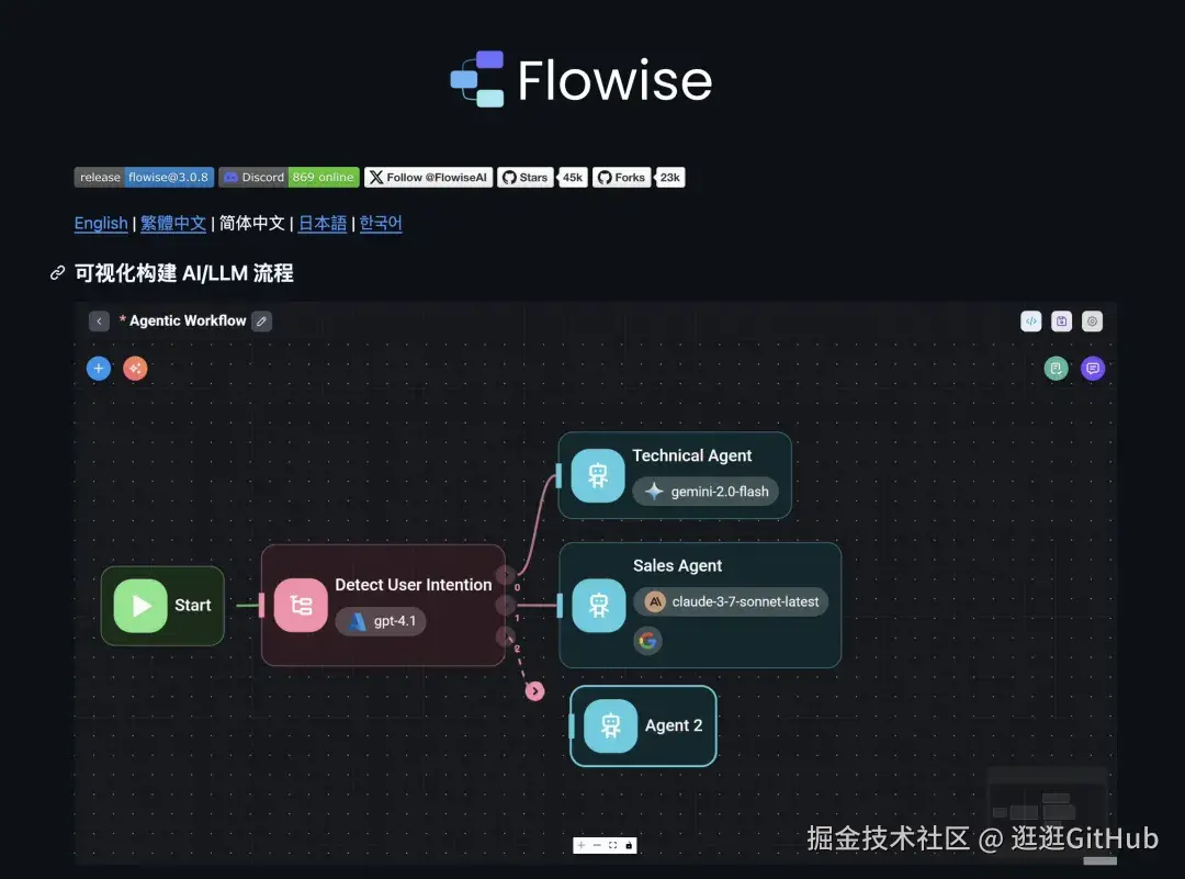 Flowise 通过可视化的方式创建 AI 智能体,在 GitHub 上竟然有 45K 的 Star。