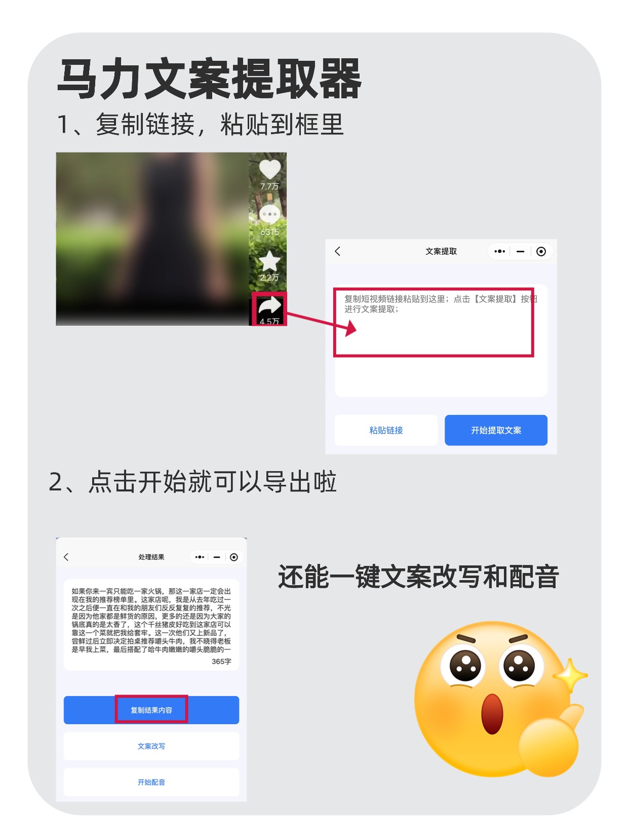 - 通用多场景 + 长视频批量需求 (自媒体、职场、教育):优先选择马力文案提取器,其在准确率、处理速度、格式兼容性及长视频批量处理能力上实现均衡覆盖,尤其适合需同步处理链接解析与本地上传长视频的复合场景。