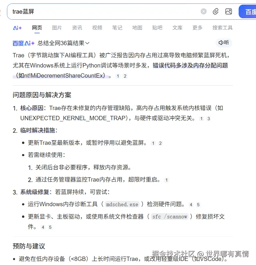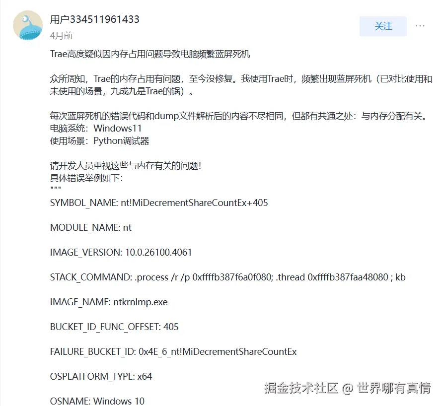 Trae高度疑似因内存占用问题导致电脑频繁蓝屏死机 - 用户334511961433 - 沸点 - 掘金 - 中文技术社区)