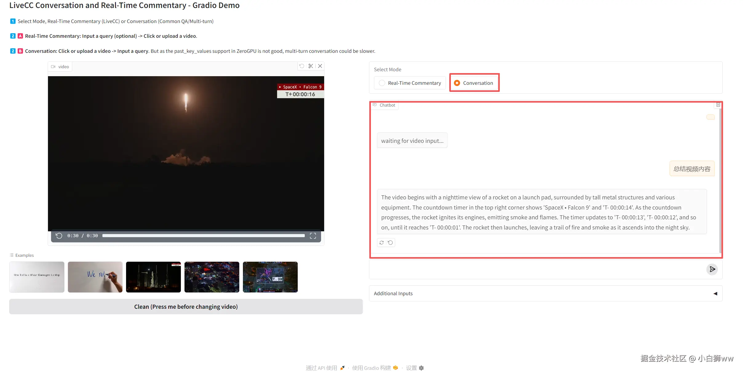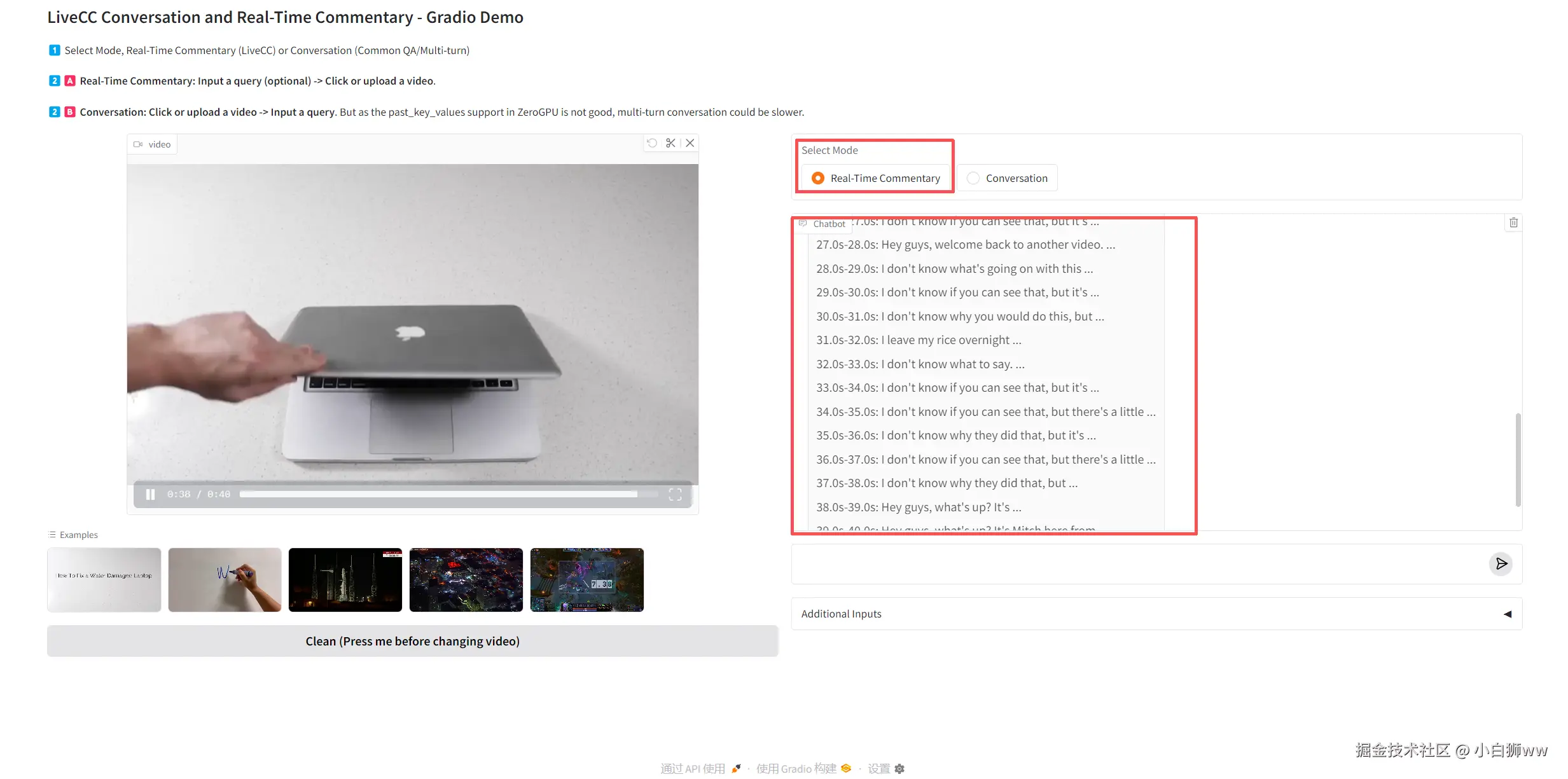 进入 Demo 页面后,首先上传一段视频,选择「Real-Time Commentary(实时字幕)」,按下回车开始运行。
