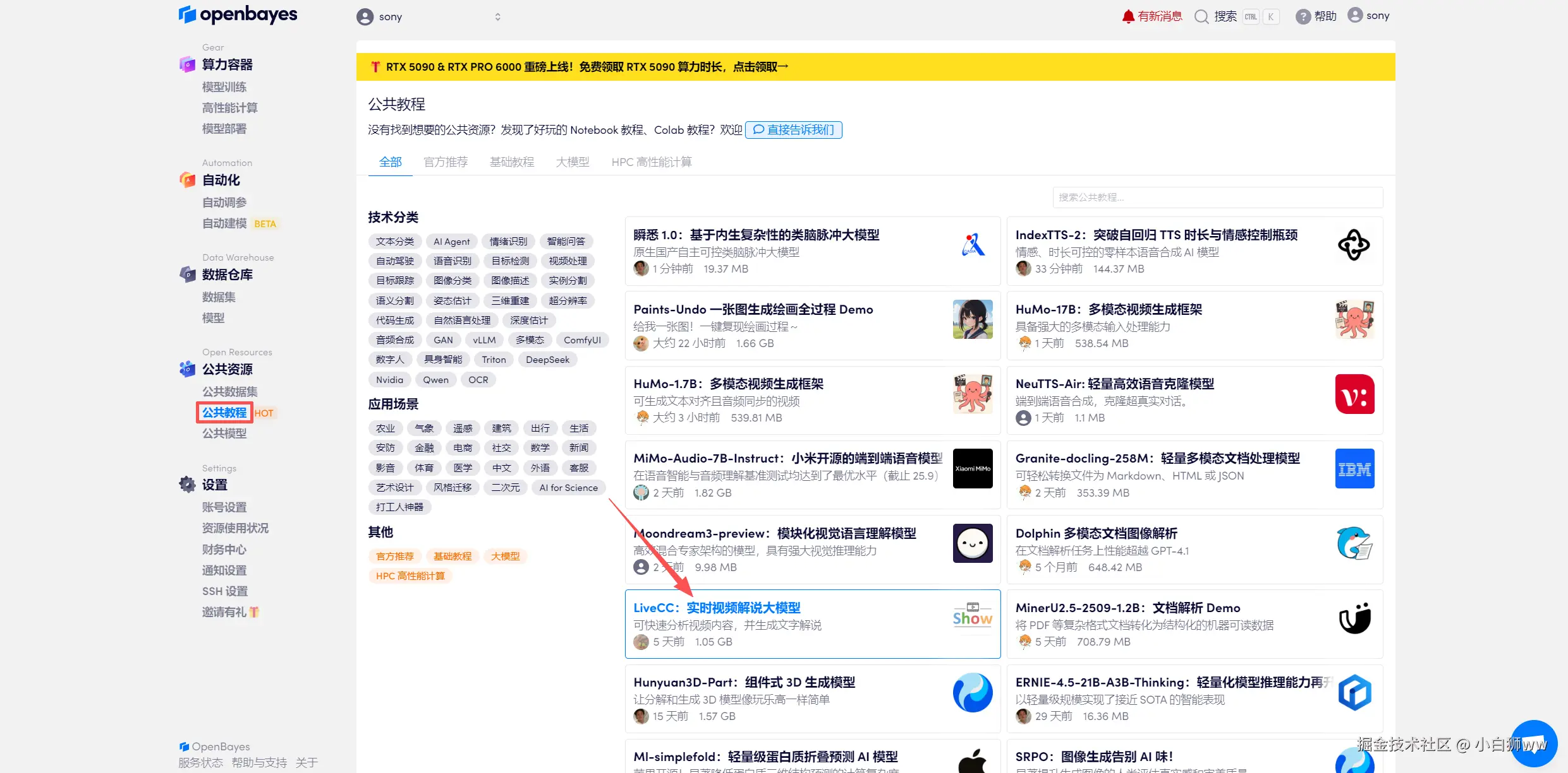 登录 OpenBayes.com,在「公共教程」页面,选择一键部署 「LiveCC:实时视频解说大模型」教程。