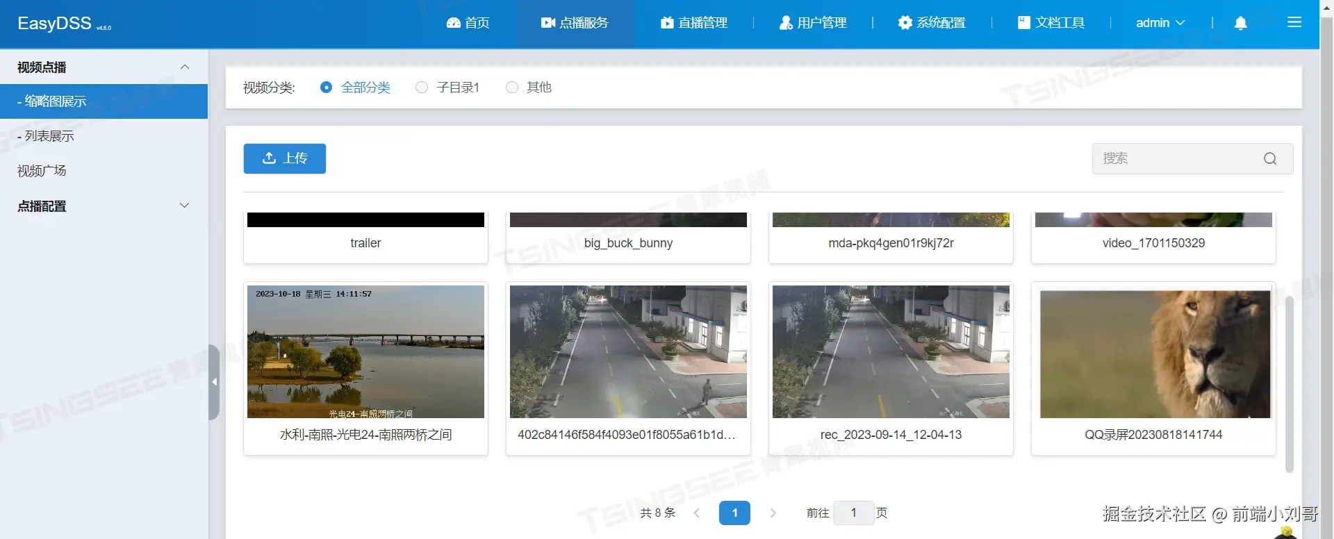 2)云端(流媒体服务器端): 通过EasyDSS软件,实现视频流的上传、转码、存储、录像、推流、拉流、直播等功能。