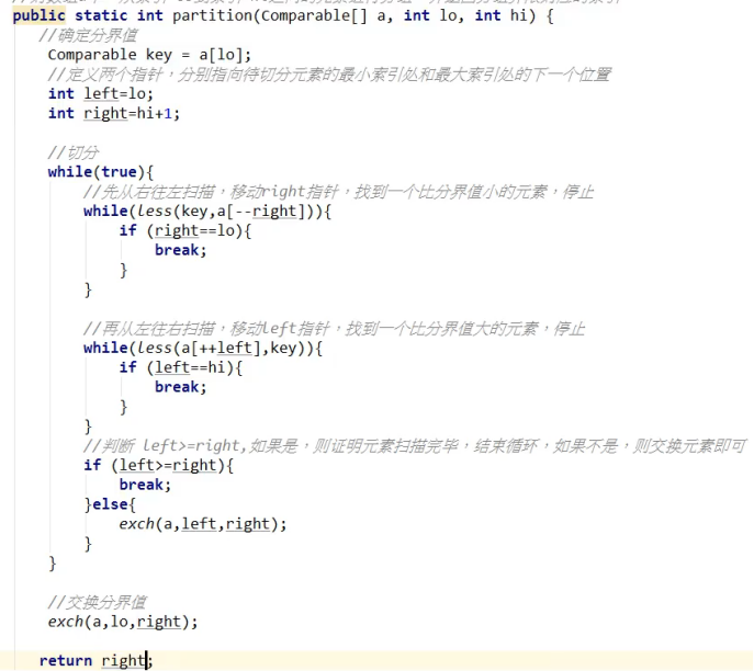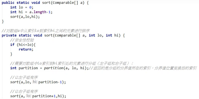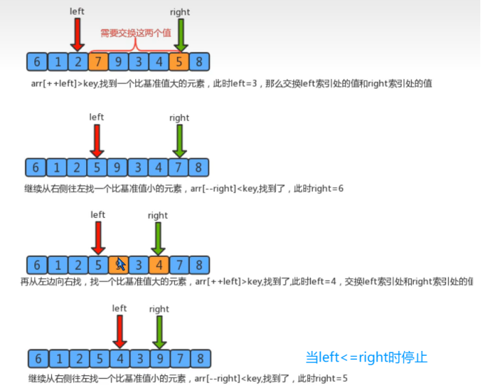 - 将大于或等于分界值的数据放到到数组右边,小于分界值的数据放到数组的左边。此时左边部分中各元素都小于或等于分界值,而