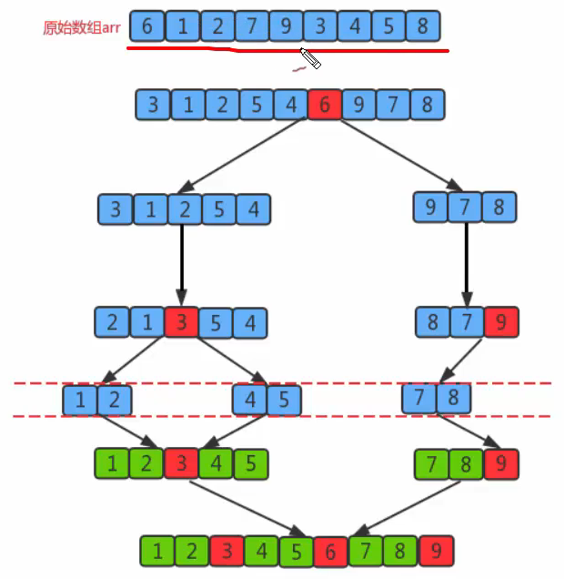 - 重复上述过程,可以看出,这是一个递归定义。通过递归将左侧部分排好序后,再递归排好右侧部分的顺序。当左侧和右侧两个部分的数据排完序后,整个数组的排序也就完成了。