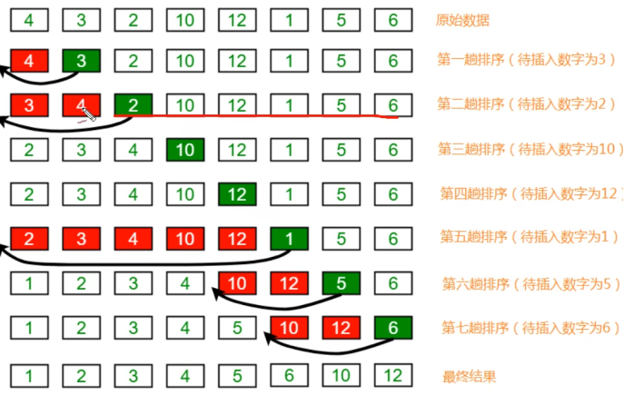 - 找到未排序的组中的第一个元素,向已经排序的组中进行插入;