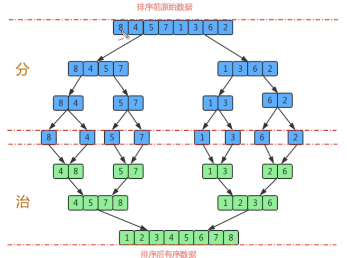 - 尽可能的一组数据拆分成两个元素相等的子组,并对每一个子组继续拆分,直到拆分后的每个子组的元素个数是1为止。