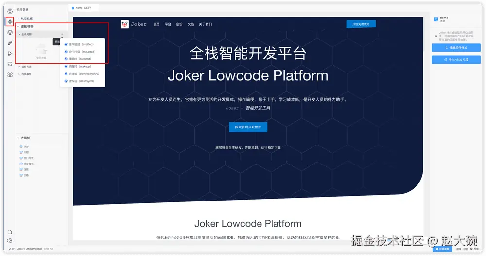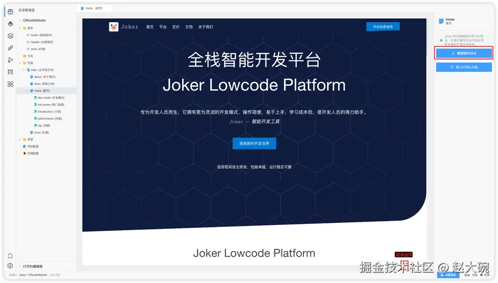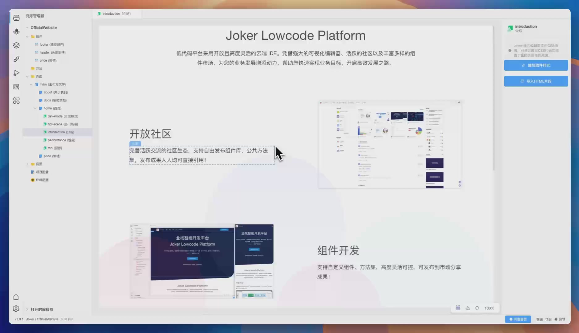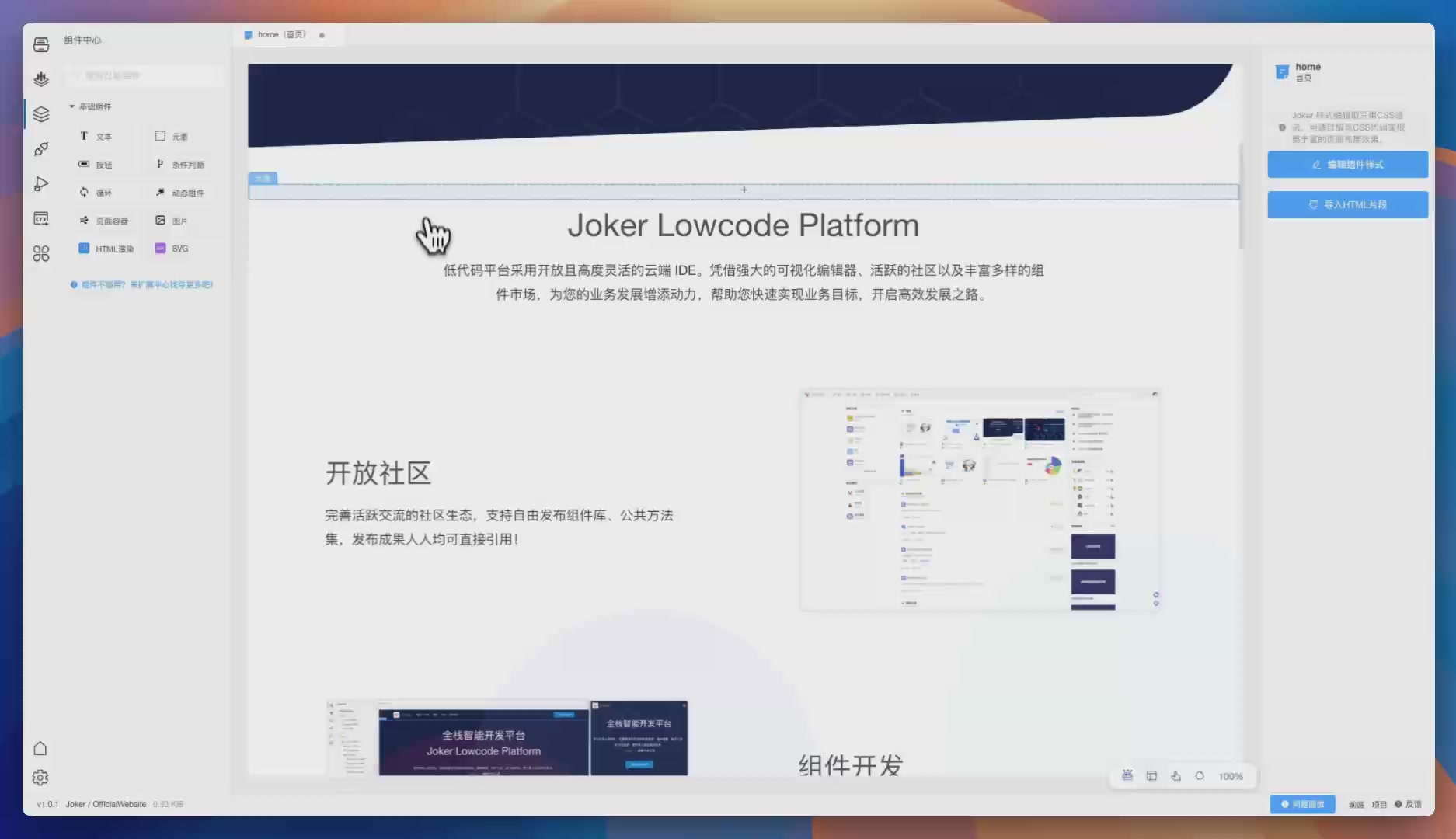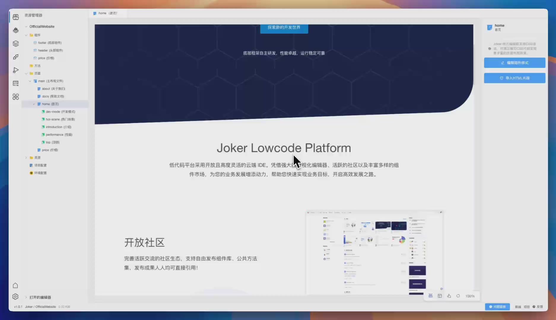 JOKER 开发平台展现出卓越的优势,它支持在线进行组件开发,且开发完成的组件无需经过编译,即可在平台内直接引用并渲染。这得益于 JOKER 开发平台自主研发的渲染与沙箱机制,实现了框架层面的高度灵活性。
