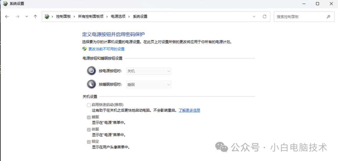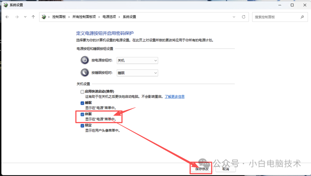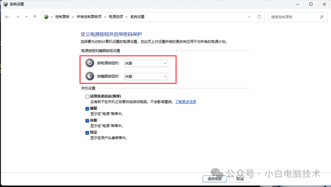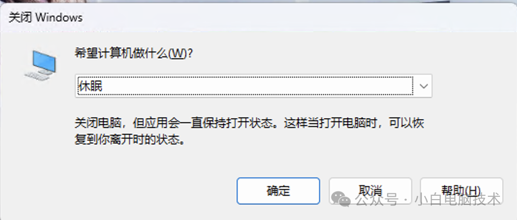把对应的选项设置为【休眠】(小白这里不是笔记本电脑,所以没有【选择关闭盖子的功能】的选项)