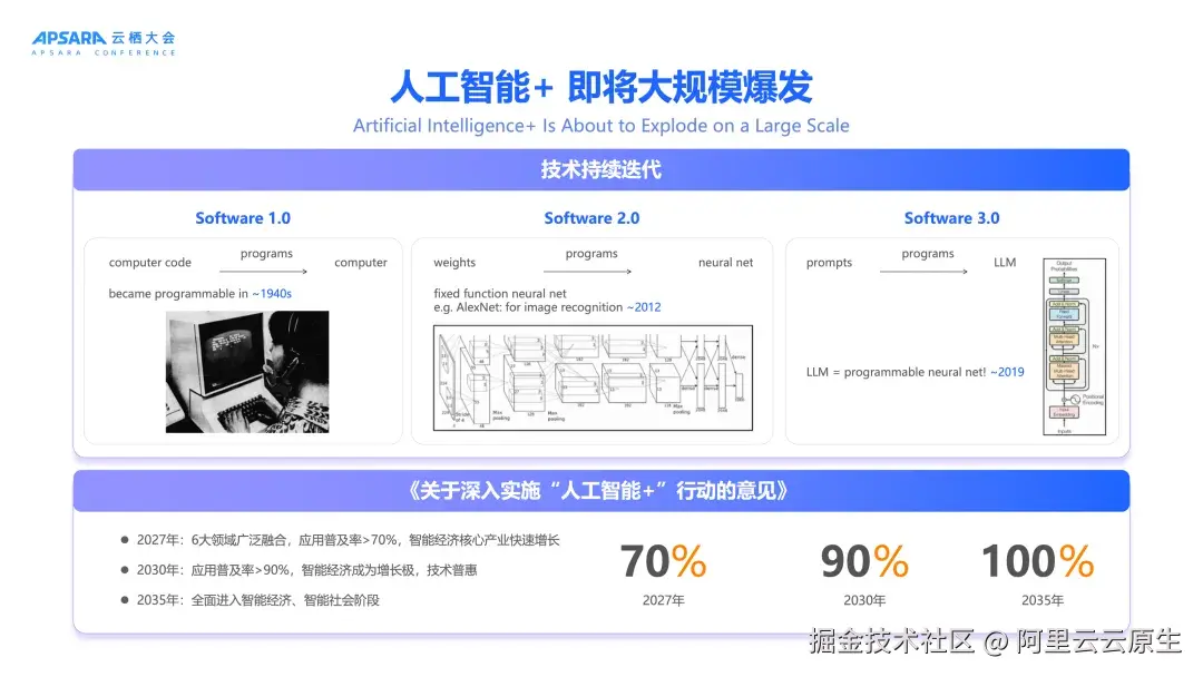 软件 3.0 时代: 大模型兴起后,进入了"面向 LLM 编程"的时代------应用的行为不再完全由代码决定,而是由大模型自主推理、决策和执行。