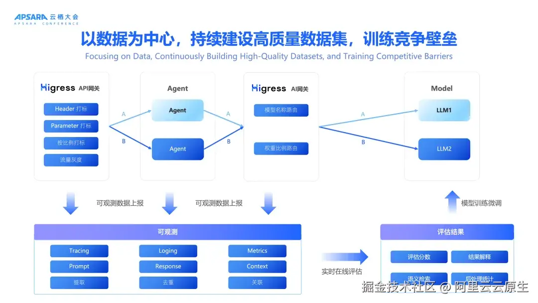 在真实流量产生之后,这个评估过程他必须是实时的、自动的。这里阿里云可观测产品支持通过日志、Metrics 等可观测数据,自动去做提取、去重、关联,生成测试集,触发实时评估。看看 A/B 测试中,到底哪个策略生成的质量更高、用户的体验更好,从而做出正确的决策。