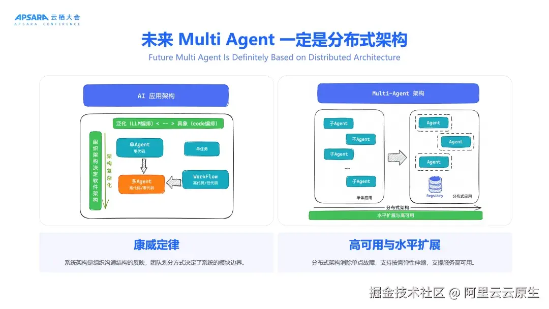 再从高可用的角度来看,传统的单体架构始终面临单点故障和性能瓶颈的风险。为了实现高可用与弹性扩展,Multi-Agent 系统必须采用分布式架构。