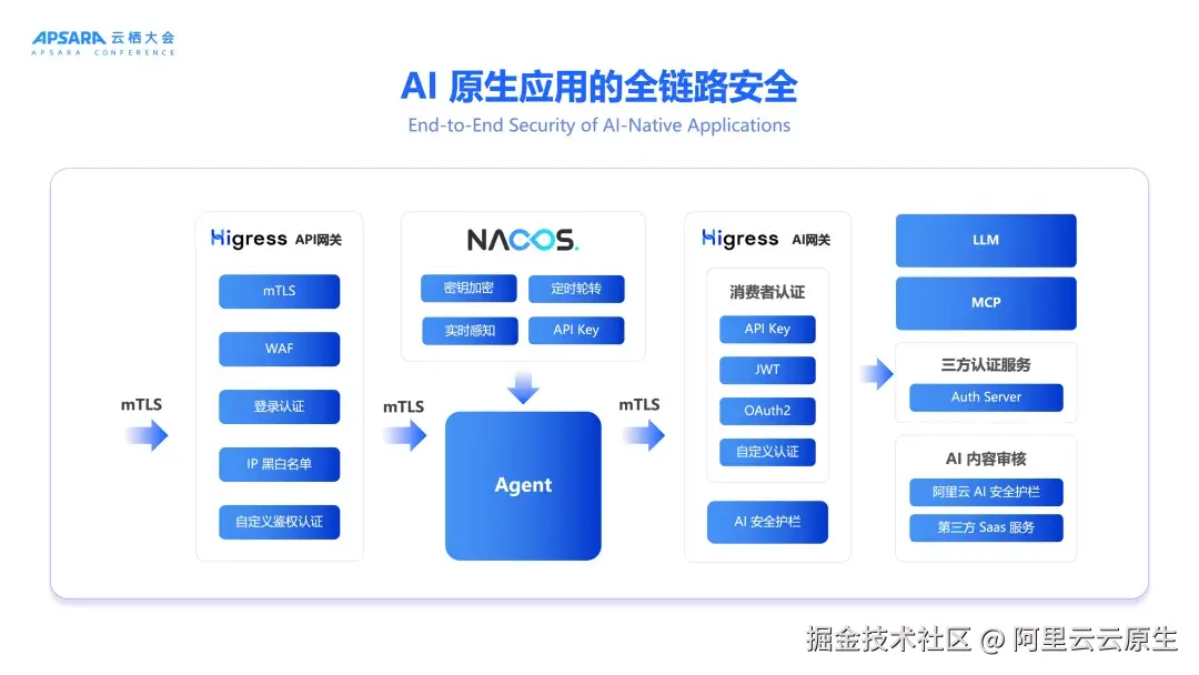 在 AI 相关配置安全方面,以 API Key 为例,引入 Nacos 作为统一配置中心,支持密钥加密存储与定时轮转,防止敏感信息泄露。并且在 Higress AI 网关中集成了多重防护机制。支持 JWT、Oauth 等多种消费者认证方式,确保调用方身份可信,有效保障 AI 资产安全。