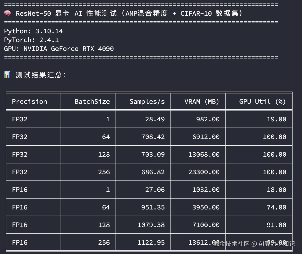 这个结果跟显卡本身的算力(TFLOPS)值存在一定的差异,当然训练还跟其他环境配置直接相关,比如机器的CPU、显卡PCIe接口的版本等,而且这个只能说明在计算机视觉模型的训练场景的性能表现,在其他应用场景,如大模型推理、文生图、科学计算等性能基准又会有不同表现,需要分开测试评估。