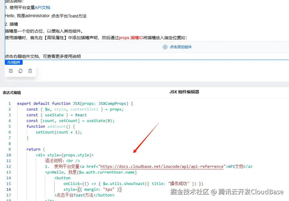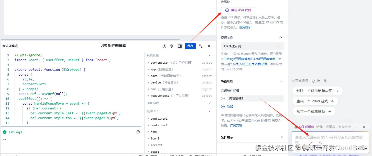 在上图中,你可能已经注意到,当我监听到 ESC 按键时,触发了一个方法,直接展示了一个弹窗。这个弹窗是通过内置的 JSX 组件语法实现的。JSX 组件语法有很多种类和功能,能够方便地构建交互式 UI 元素。若想了解更多详细信息,具体的组件使用和 API 文档可以参考以下链接:CloudBase 文档 - 工具 API。