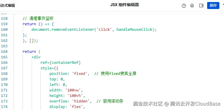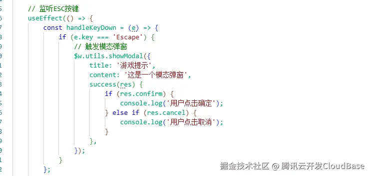 同样地,针对更复杂的自定义样式和交互需求,除了常规的 JavaScript 代码实现外,我们还可以使用 JSX 来编写各种事件监听器,例如按键事件。虽然官方文档中主要提供了鼠标点击事件的实现方式,但在某些特定场景下,比如在我的游戏中需要通过按下 ESC 键来退出游戏,这类需求无法仅通过点击事件来满足。因此,对于这类特定需求,我们可以直接在 JSX 代码中编写相应的按键监听逻辑。如图所示: