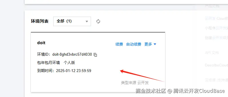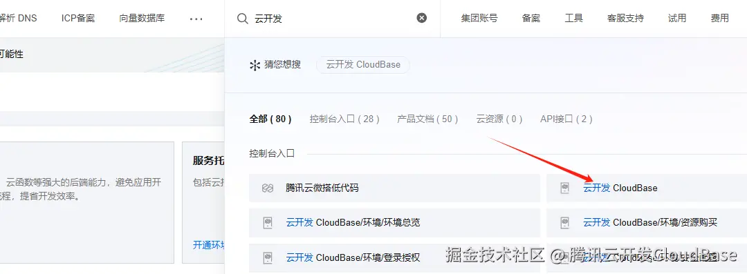 我们不绕弯子,直接进入主题。如果你还没有开通腾讯云的相关服务,只需前往腾讯云控制台,搜索"云开发"并按照提示完成开通即可,整个过程简单直观,非常容易上手。由于此部分内容较为基础,不再在文章中详细展开讲解。如图所示: