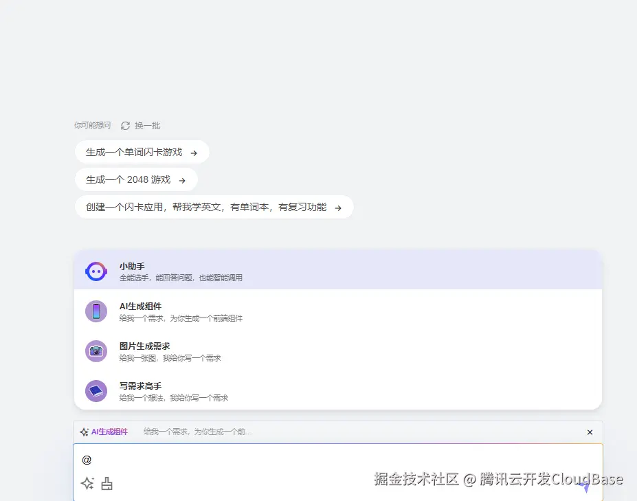默认情况下,云开发平台中包含了多个智能体助手,用户可以根据实际需求通过@标记来调用对应的助手功能。具体操作方法请参见下图所示: