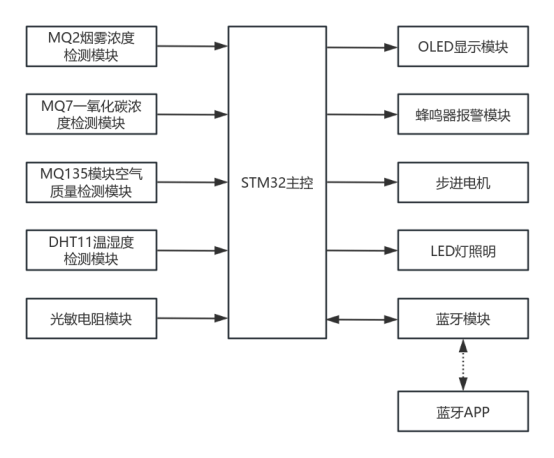 1)传感器检测:烟雾浓度、空气质量、一氧化碳、温湿度、光照