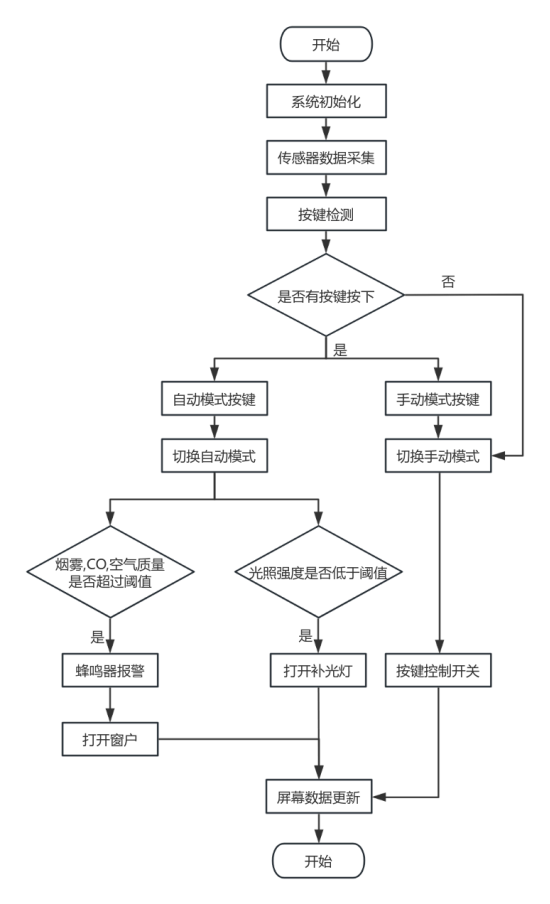 系统不仅支持用户远程手动控制,如开关窗户(由步进电机模拟)、控制声光报警和照明设备,还具备自动模式,可依据传感器数据智能决策。例如,一旦检测到烟雾或一氧化碳超标,系统会立即启动报警器并自动开窗通风,有效降低安全隐患;在夜晚或光照不足时,系统可自动点亮灯光,提升家庭舒适度。这种以数据驱动控制逻辑的智能响应机制,真正实现了从"被动控制"向"主动管理"的转变。