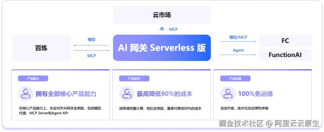 AI 网关在云栖前上线了 Serverless 版,相比专享实例版,Serverless 版极大地降低了开通和使用成本,在阿里云 Serverless AI 场景的大图上补上了重要的一块。AI 网关结合百炼、FC/FunctionAI 和云市场,用户可构建完整的 Serverless AI 基础设施。。