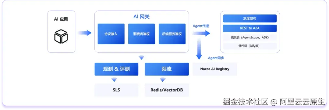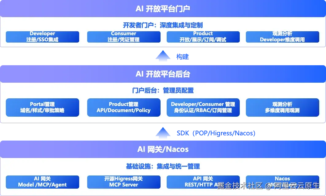 - AI 网关/Nacos:这一层为基础设施,通常只有管理员可见,并通过 AI 开放平台后台进行统一管理与集成。