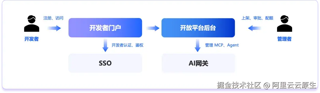 按照最简的抽象视角,AI 开放平台面向两类角色:开发者和管理者,开发者申请和使用开放平台上的各类 MCP Server 和 Agent,构建自己的 AI 应用,管理者维护开放平台上的各类资产,对 MCP Server 和 Agent 进行上架,对开发者进行认证、审批和设定配额,并管理实际承载 MCP Server 和 Agent 的各个 AI 网关。于是,在用户界面上,AI 开放平台分为主要面向开发者的开发者门户,和主要面向管理者的开放平台后台。开发者门户主要承接开发者的注册和访问,与企业 SSO 对接,实现开发者的认证和鉴权。开放平台后台主要承接管理者的各类诉求,包括门户的管理、资产的管理、网关的管理等。