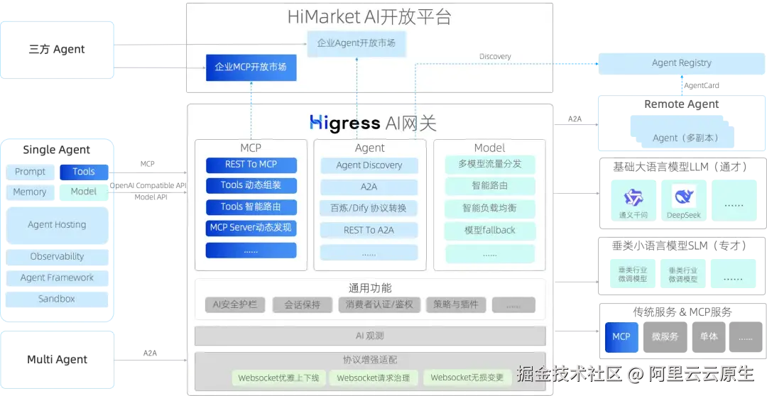 受限于当时 AI 应用的发展水平,最初的商业版 AI 网关只提供了模型代理的能力,但在过去半年中,AI 应用快速发展,MCP、A2A 等协议也逐渐成为主流,AI 网关也从模型代理发展到包含模型、MCP、Agent 三大 API 形态,集成各种治理能力的 AI 应用的统一入口。同时在 AI 网关之上以开源形式独立发展出了 HiMarket AI 开放平台。