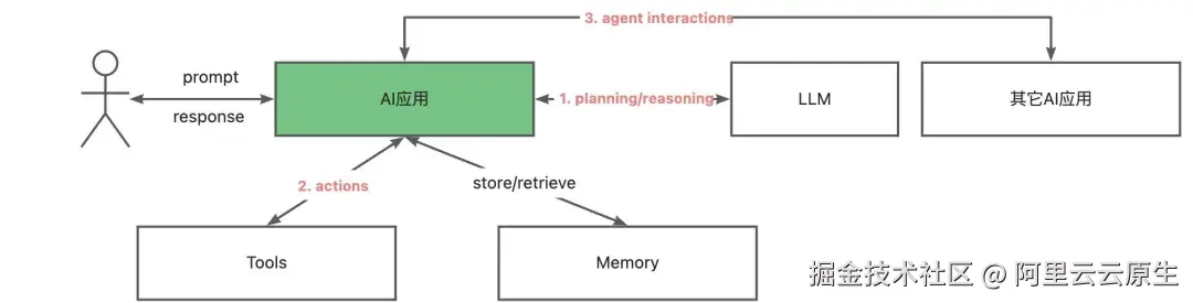相对于传统应用,AI 应用具有明显的架构特征,简单来说即以模型为中心,通过模型的推理能力,给定提示词,借助工具和记忆,来满足特定的业务诉求。