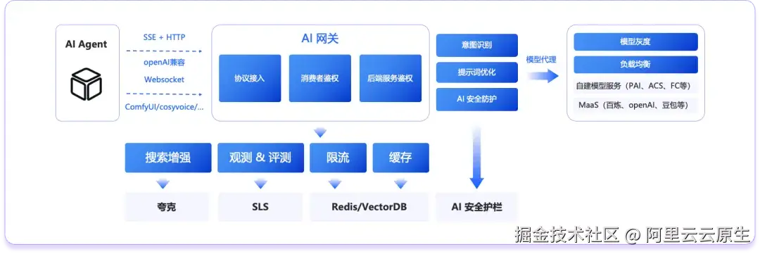 - 多模态:AI 网关支持代理 HTTP 和 Websocket 两种传输协议的多模态模型调用,AI 应用可以像使用文生文模型一样,按照统一的接入点接入多模态模型,同时,网关管理员可以通过插件等能力增强多模态模型的安全和稳定性。