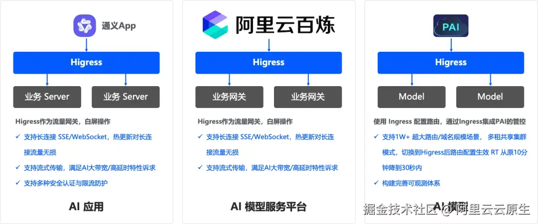 在推出商业版的 AI 网关之前,Higress 在阿里云内部进行了大量的探索,当前已成为阿里云 AI 流量的核心承载网关,包括通义 APP、阿里云百炼、PAI 等服务,背后都有 Higress 的身影。