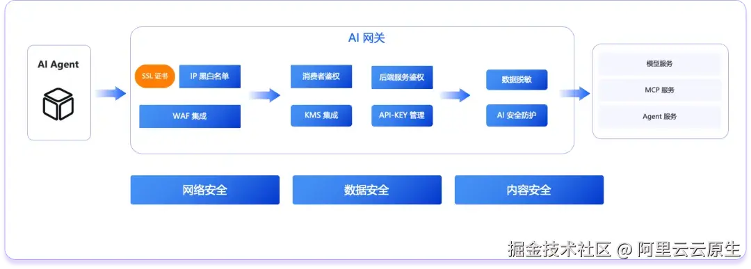 针对 AI 原生架构的安全挑战,AI 网关从网络安全、数据安全和内容安全三个层面进行了安全防护。