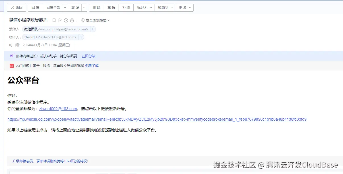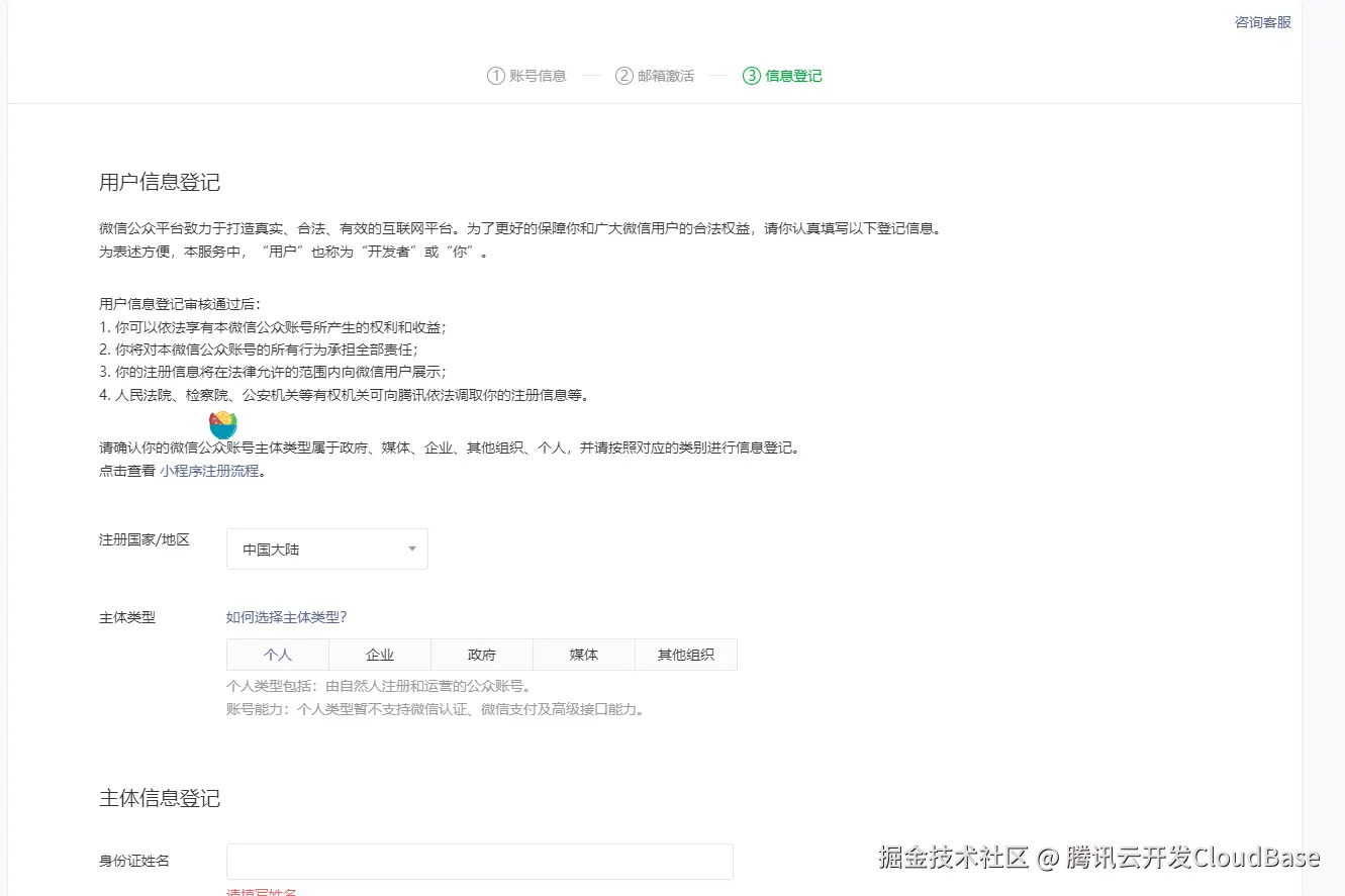 安装1-4步骤,完成信息填写,对于个人的开发小程序的开发者而言,最后需要30块的消费;完整全的注册内容;
