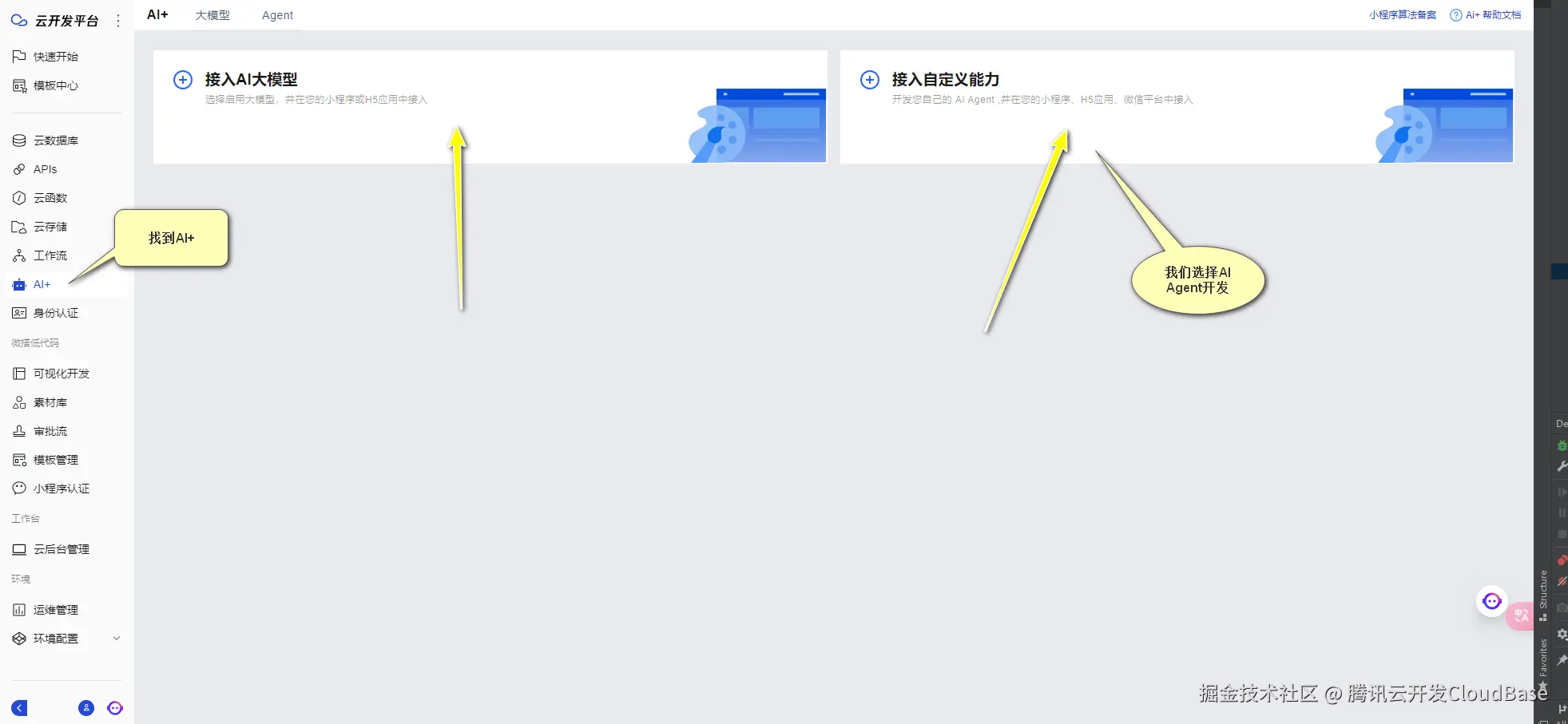 在左侧的菜单中,找到AI+的按钮,点击后,选择"接入自定义能力";