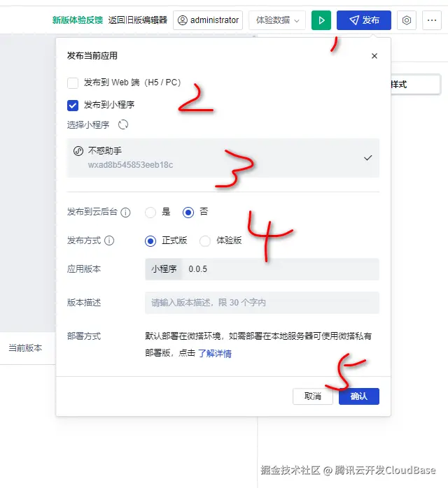 点击发布按钮,选择发布到小程序,选择我们刚刚创建的小程序,发布方式为正式版本。增加版本描述,最后点击确认按钮即可;