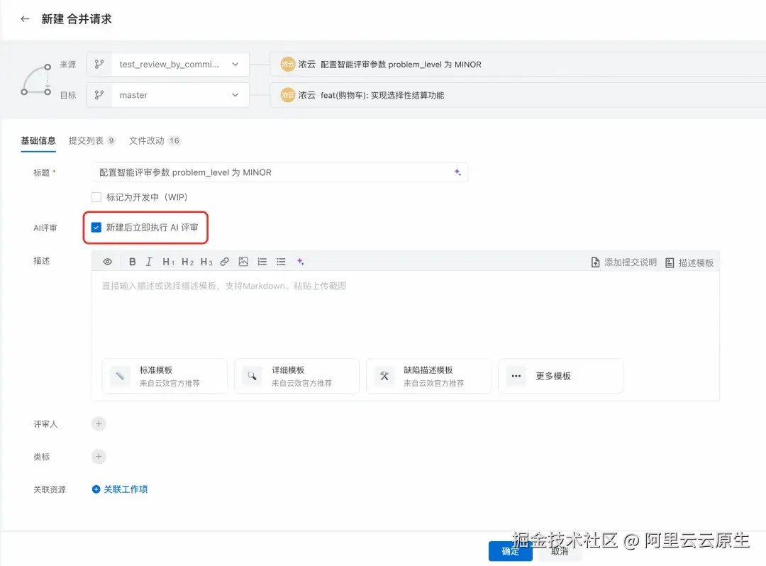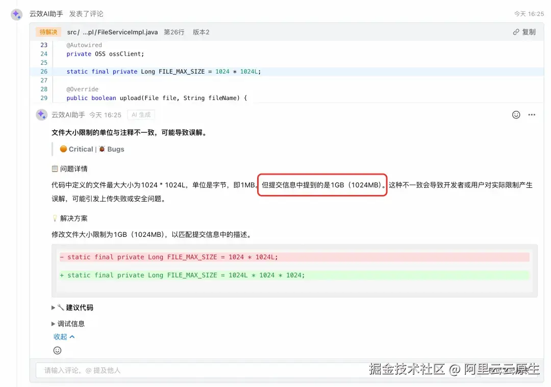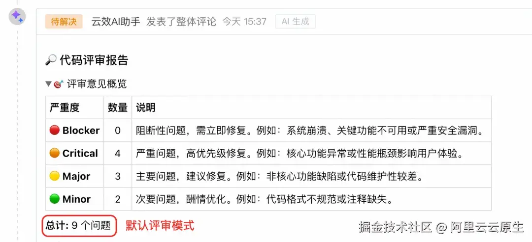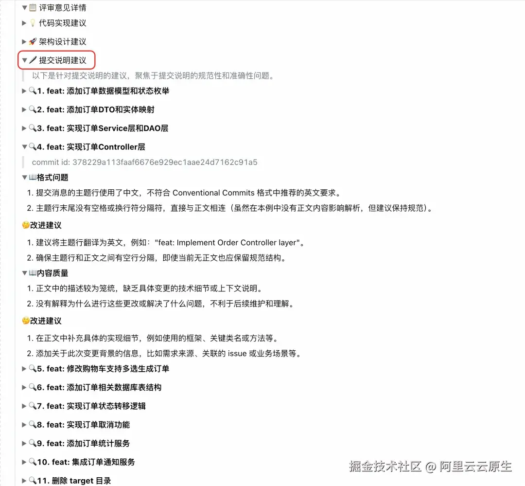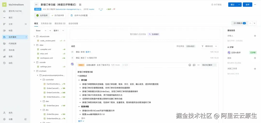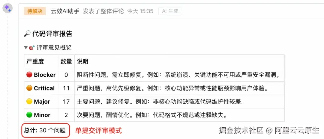 1\]《[开发效率翻倍!编码助手+云效 AI 评审如何破解代码质量与速度难题?](https://link.juejin.cn?target=https%3A%2F%2Fmp.weixin.qq.com%2Fs%3F__biz%3DMzUzNzYxNjAzMg%3D%3D%26mid%3D2247577266%26idx%3D1%26sn%3D603f7428594574cb36f8aa62a864fcbf%26scene%3D21%23wechat_redirect "https://mp.weixin.qq.com/s?__biz=MzUzNzYxNjAzMg==&mid=2247577266&idx=1&sn=603f7428594574cb36f8aa62a864fcbf&scene=21#wechat_redirect")》 \[2\] 代码评审 AI 助手 [help.aliyun.com/zh/yunxiao/...](https://link.juejin.cn?target=https%3A%2F%2Fhelp.aliyun.com%2Fzh%2Fyunxiao%2Fuser-guide%2Fai-intelligent-code-review "https://help.aliyun.com/zh/yunxiao/user-guide/ai-intelligent-code-review") \[3\] Conventional Commits [www.conventionalcommits.org/en/v1.0.0/](https://link.juejin.cn?target=https%3A%2F%2Fwww.conventionalcommits.org%2Fen%2Fv1.0.0%2F "https://www.conventionalcommits.org/en/v1.0.0/") \[4\] How to Write a Git Commit Message [cbea.ms/git-commit/](https://link.juejin.cn?target=https%3A%2F%2Fcbea.ms%2Fgit-commit%2F "https://cbea.ms/git-commit/") \[5\] 单提交评审模式示例代码库 [atomgit.com/vagary/MyOn...](https://link.juejin.cn?target=https%3A%2F%2Fatomgit.com%2Fvagary%2FMyOnlineStore "https://atomgit.com/vagary/MyOnlineStore")