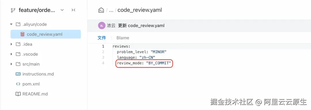 参考自定义 AI 评审规则,在源分支下的 AI 评审规则文件 .aliyun/code/code_review.yaml 中设置评审模式 review_mode 为 BY_COMMIT,即单提交评审模式。