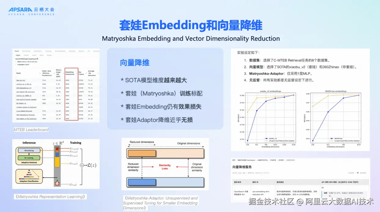 针对向量检索中高维度带来的存储与计算压力,阿里云实现套娃 Adaptor 技术,通过在 Embedding 模型后添加轻量级 MLP 映射层,在无监督场景下将向量维度压缩至 512 维的同时保持近似完整向量的精度。