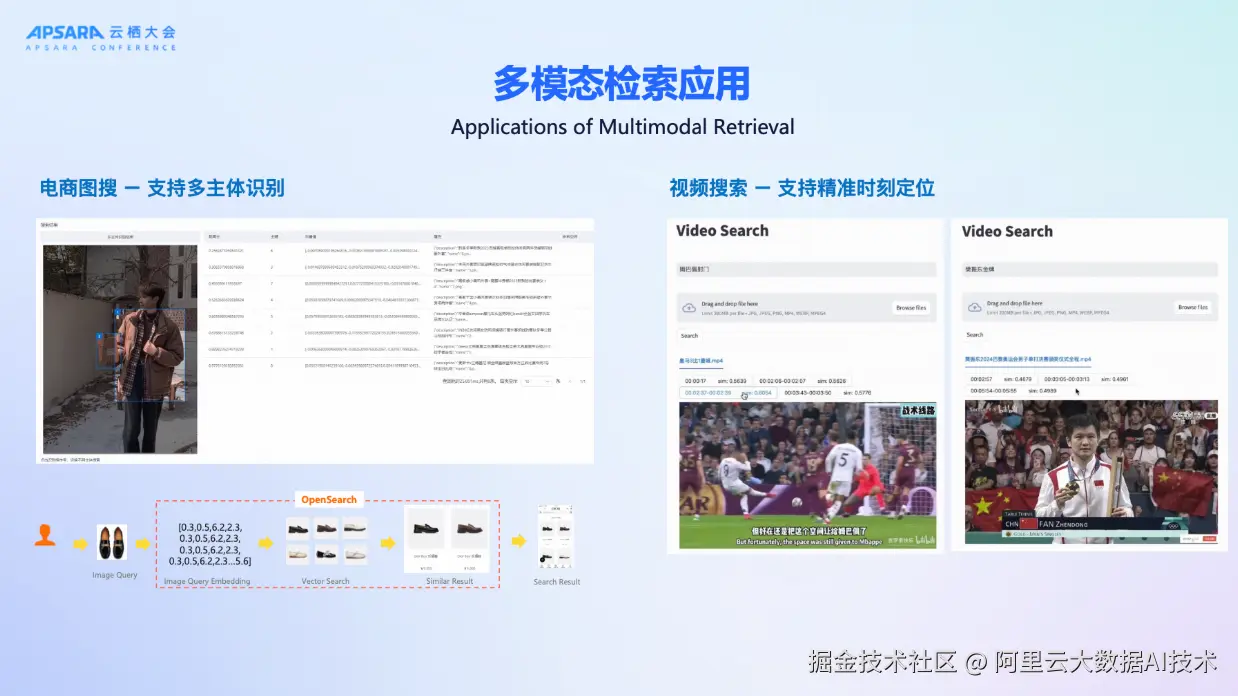 结合 OpenSearch 提供的电商图搜与视频精准定位能力,企业可实现商品拍摄搜、视频关键帧索引等场景应用。这类应用不仅大幅提升了检索的准确性与响应速度,还带来更直观、高效的交互体验,为电商推荐、体育赛事分析、影视版权管理等提供了强大动力支撑。