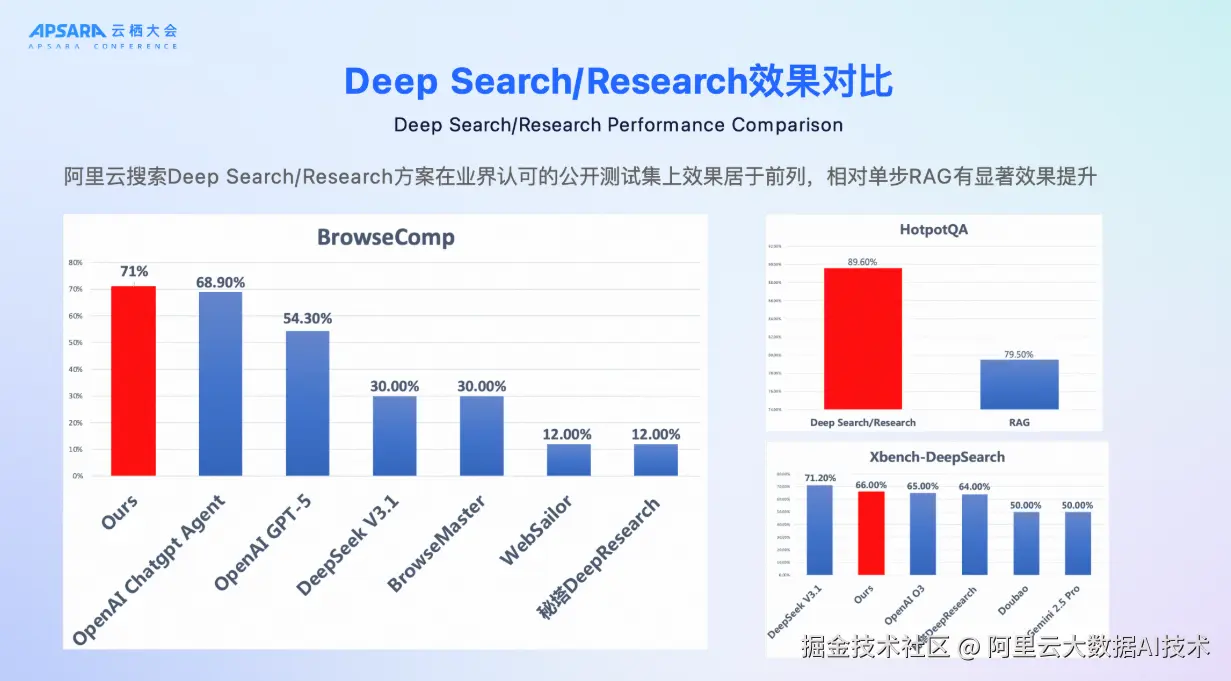 在权威基准评测中,阿里云 Deep Search/Research 展现了强大的跨任务适应性和复杂问题处理能力。无论是在多轮深度检索任务(BrowseComp)、多跳推理任务(HotpotQA),还是综合搜索评估(Xbench-DeepSearch)中,该方案都稳居行业前列,并较传统单步 RAG 模式实现大幅性能提升。这证明了其在任务分解、多工具协作、记忆驱动推理等创新机制上的显著优势,为科研分析、竞争情报、深度数据研究等高难度应用场景提供了更高准确率与更稳健的解决方案。