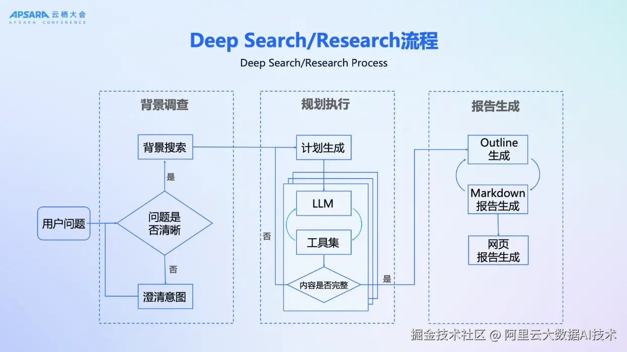 在 Deep Search/Research 的执行过程中,阿里云将任务处理拆分为背景调查---规划执行---报告生成 三个阶段。这一流程确保了从用户提问到成果产出的全过程可控、精确与高效,特别适合多步推理和复杂研究类任务。具体流程图如下:
