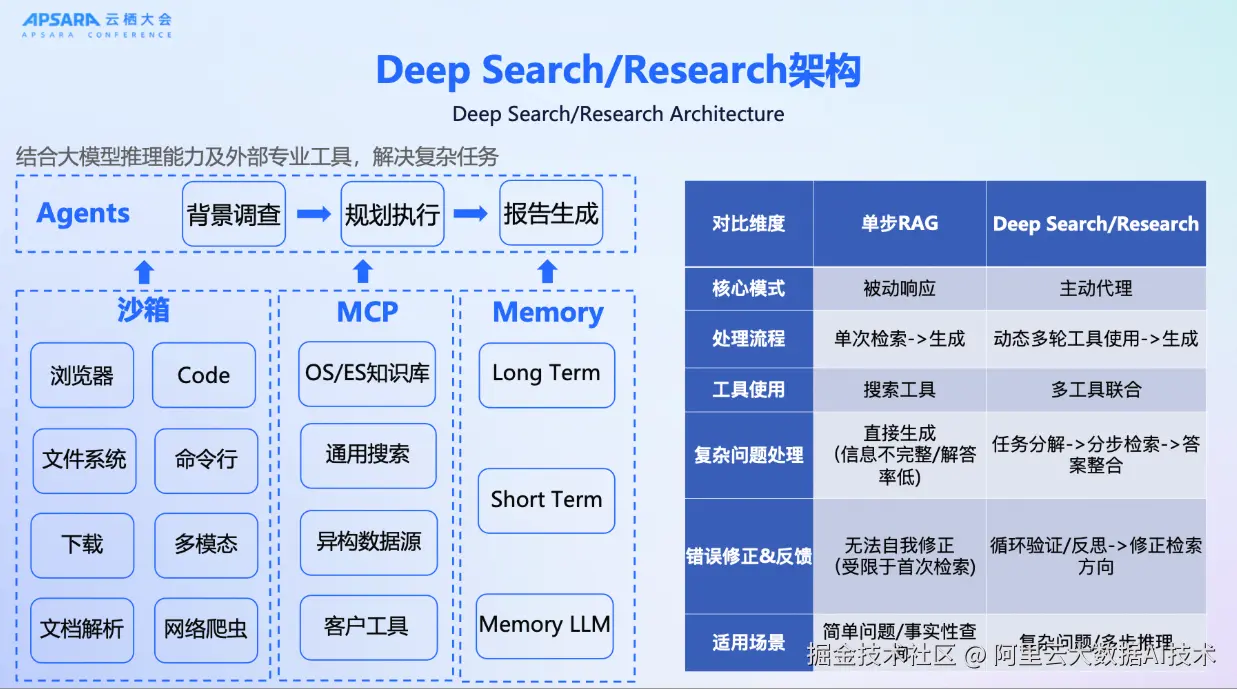 针对深度搜索与科研级复杂需求,阿里云构建了 Agentic Search 智能体系统,其核心技术亮点包括: