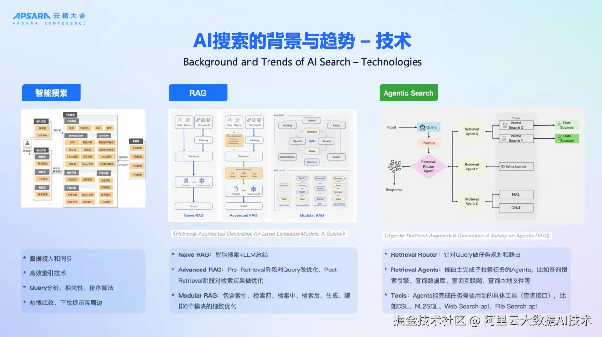 阿里云 AI 搜索的演进,展示了搜索领域从关键词匹配 → 语义理解 → 多模态融合 → 多 Agent 协作研究 的技术飞跃。
