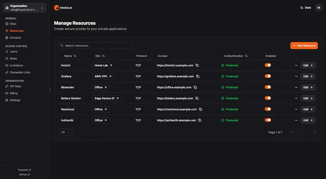 和NetBird这类纯组网工具相比,Pangolin多了一个反向代理组件,从而替换了传统VPN必备的客户端组件(当然也可选),让自托管服务的管理从网络层来到了应用层。