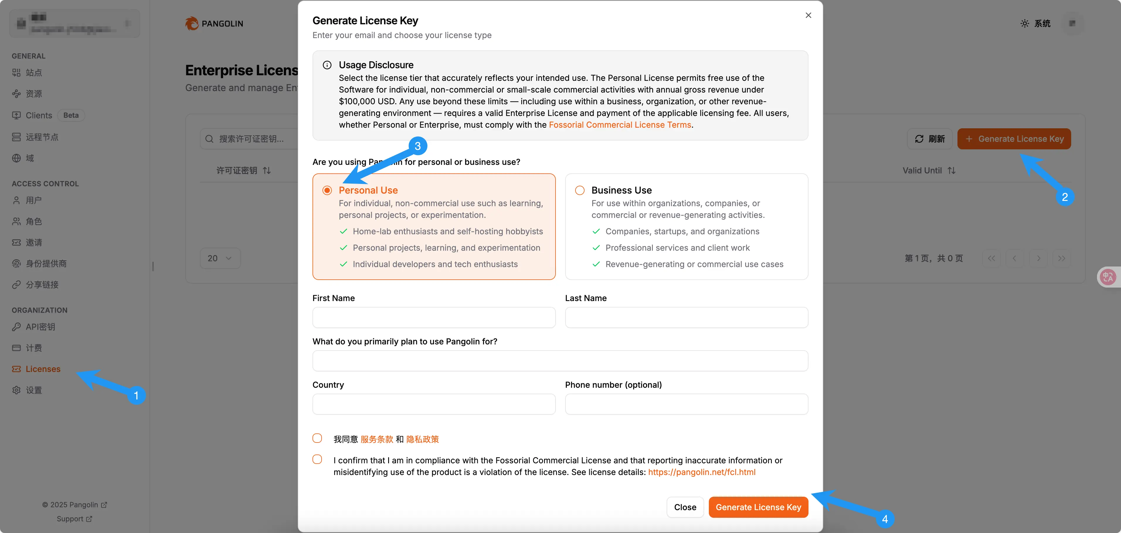 注册账号并登录官方的Pangolin云服务:app.pangolin.net/,根据下图的步骤完成证...