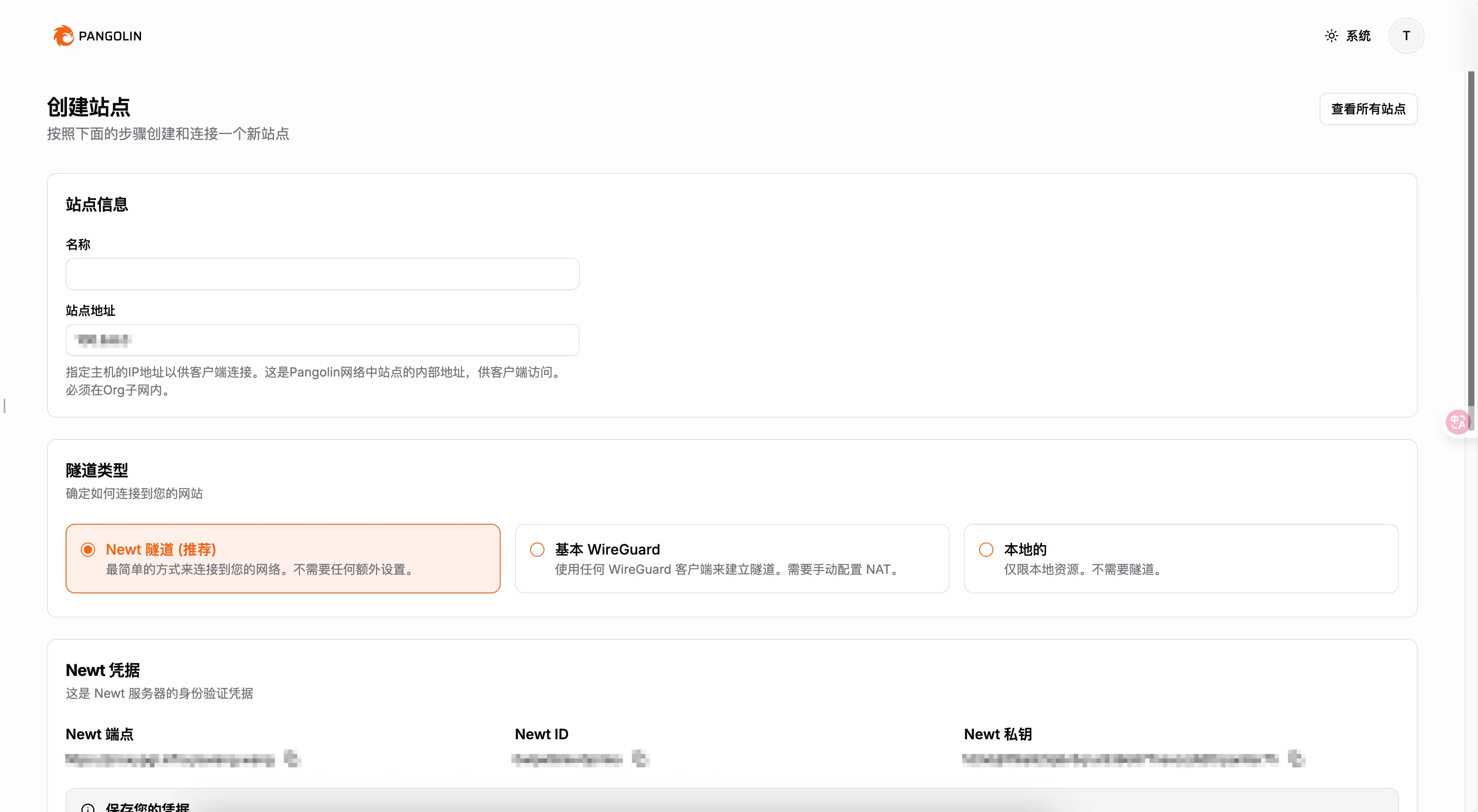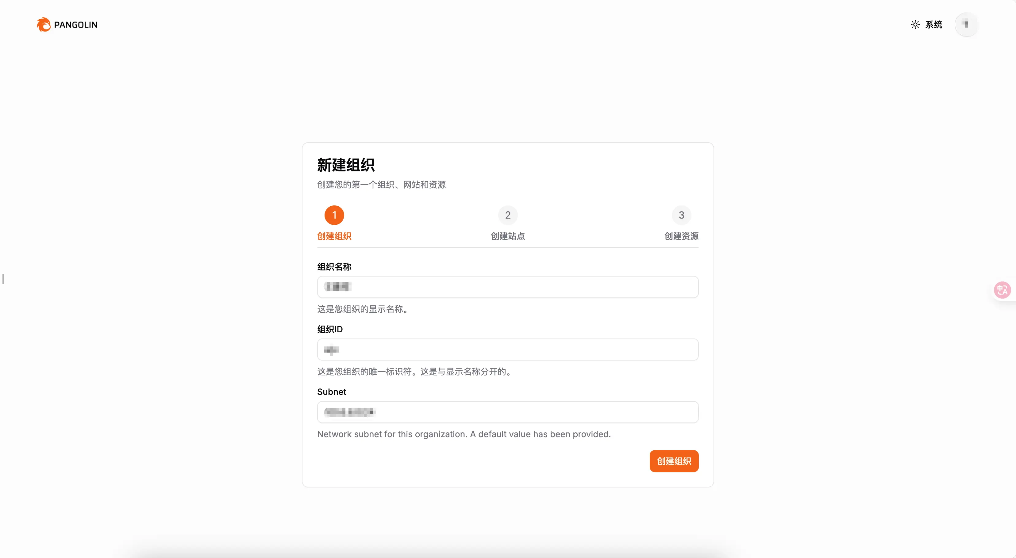 首先,创建组织,然后按照提示创建站点,站点可以理解成用WireGuard(当然也可以不用)连接的后端网域。
