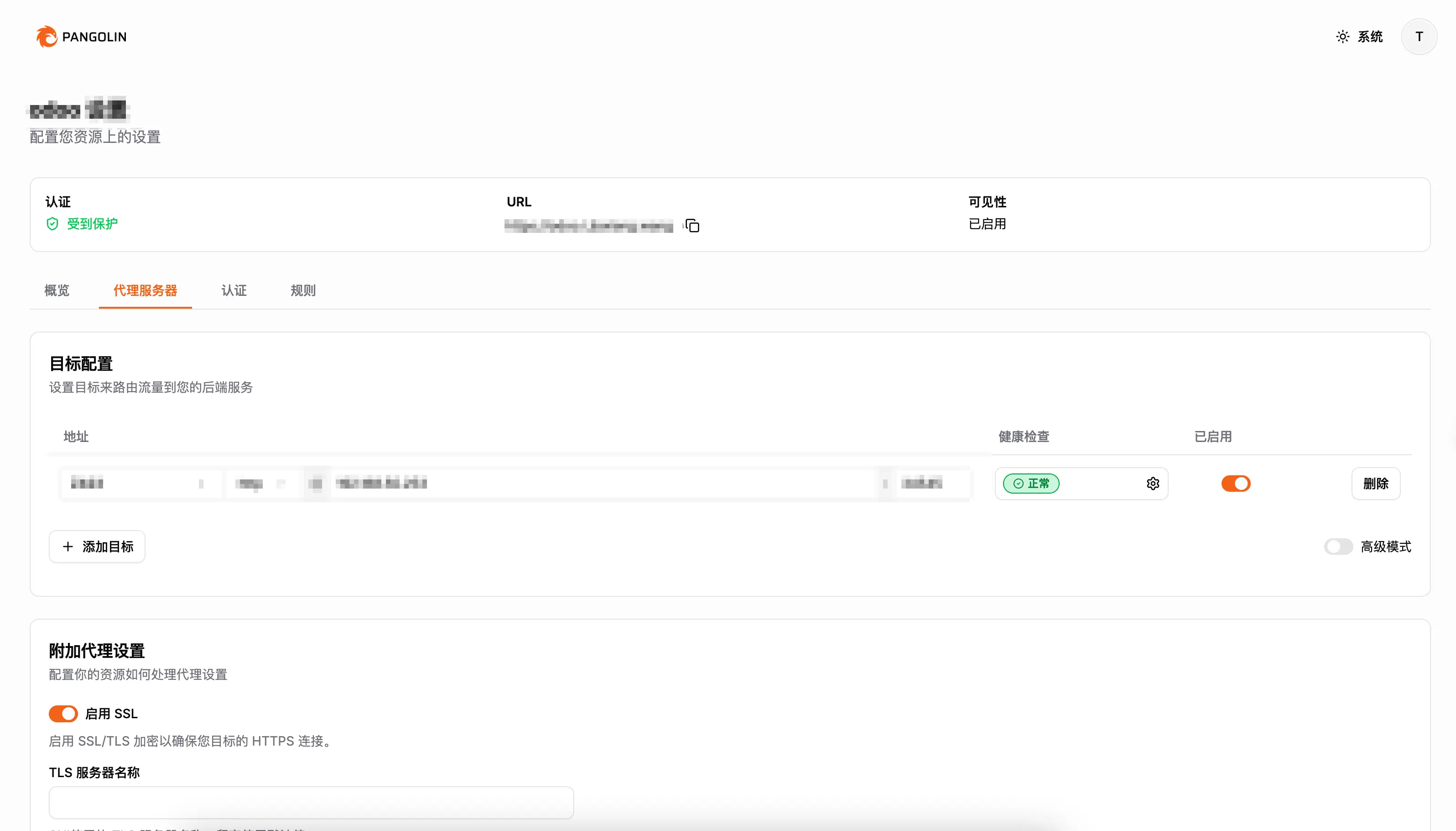在系统已有的反向代理中添加Pangolin网站,并设置反向代理到本地IP的端口(前文已经配置好,根据你的情况选择,代理HTTP协议就选择 80 端口的替代 1180,代理HTTPS协议则选择 443 端口的替代 11443)。