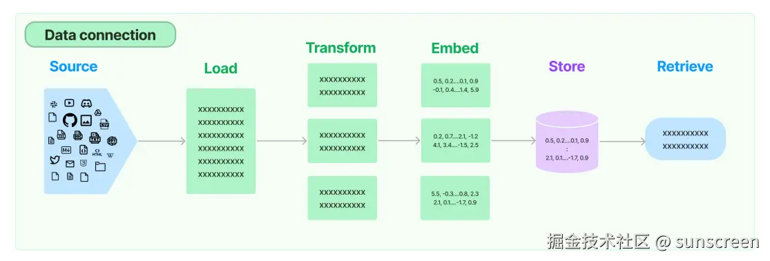 Retrieval直接翻译过来即"检索",本章Retrieval模块包括与检索步骤相关的所有内容,例如数据的获取、切分、向量化、向量存储、向量检索等模块。常被应用于一个"企业/私人的知识库