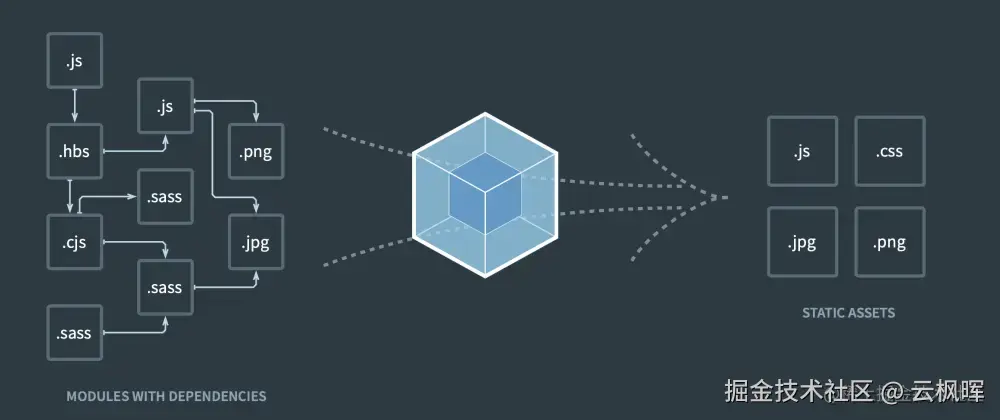 (JS、sass/less、图片、字体、TS),通过分析它们之间的依赖关系,最终打包成浏览器能直接识别的静态资源(JS或CSS等文件)。